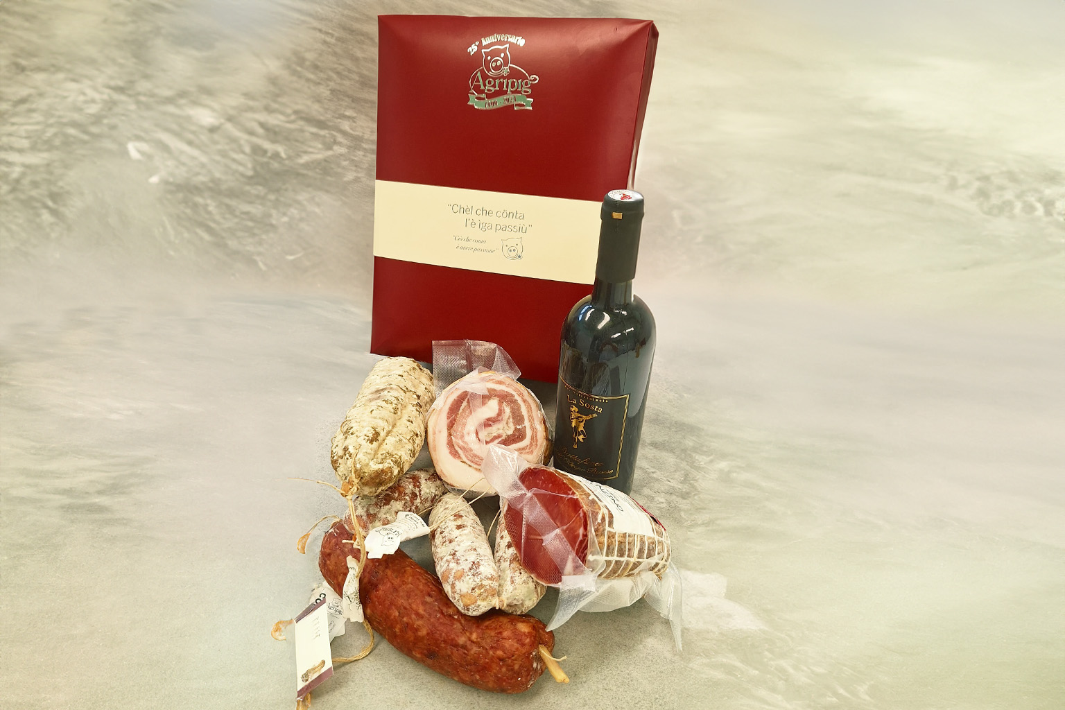 Trancio di pancetta, salame nostrano, cotechino, cacciatorini e una bottiglia di vino. Il cesto ideale per ogni occasione!